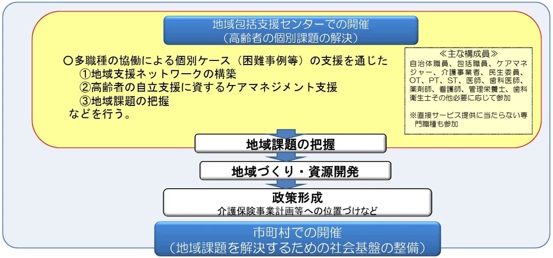 地域包括支援センターが中心となり、個別支援の充実と地域課題の共有・改善を同時に進める仕組みとして位置づけられる。課題分析を通じて、地域資源の開発や介護保険事業計画への反映にもつながる点が特徴だ。