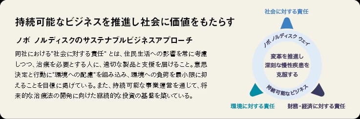 当社の母体であるノボ ノルディスク財団は、「人々の健康と社会・地球の持続可能性を高めること」をビジョンに掲げています。その理念のもと、深刻な慢性疾患の克服に向けて、自治体の皆さんのパートナーとして協働できることを願っています。