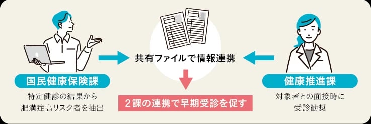 初めに取り組んだのは庁内での意識統一だった。「仕組みをつくる前に、保健指導をする職員がその必要性を感じることが重要。会議を重ね、どのように向き合うべきかを考えました」。さらに上長や関係者へ説明を行い、事業に対する意識を共有し、方針を決めていったという。