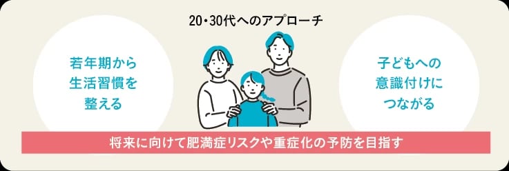 20・30代に早くから働きかけ若年期に生活習慣を整える。