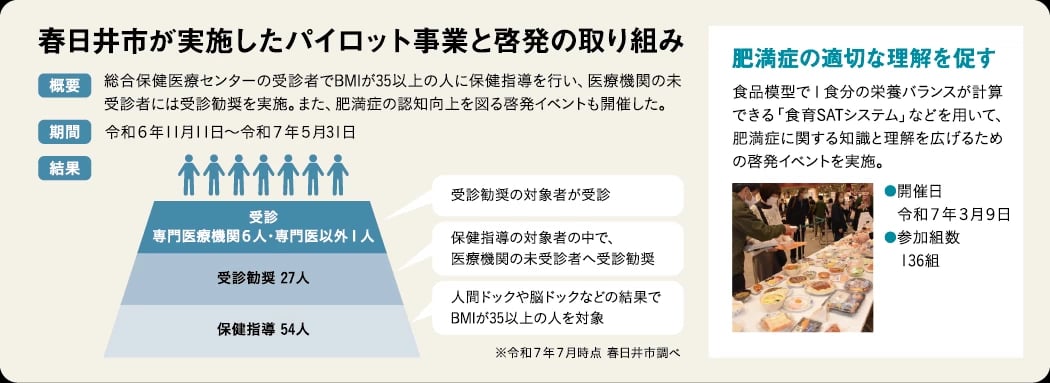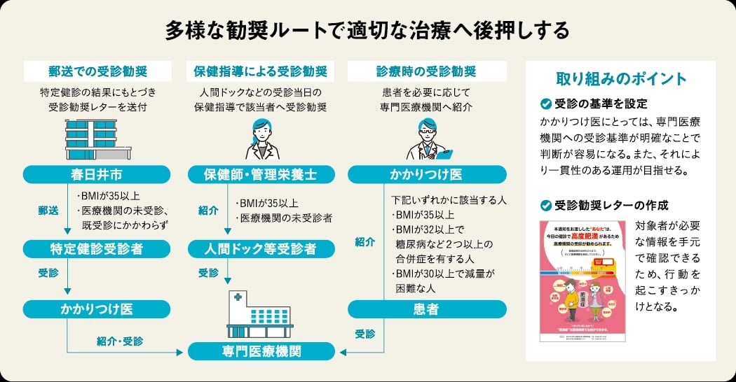 パイロット事業に手応えを得て、今後は市内全域への拡大を目指し、本格始動の準備も進んでいると神戸さんは語る。「国民健康保険加入者の特定健診の結果から、BMIが35以上の対象者を抽出して受診勧奨レターを郵送する予定です。また、医師会にも働きかけ、かかりつけ医からも専門医療機関の受診を促してもらえるよう協力を依頼します。医師会から“紹介の判断基準が明確であれば対応がしやすい”と助言をもらい、基準の作成にも取り組みました」。そのほか、市が主催する健康づくりイベントなどでも周知・啓発を行っていくという。