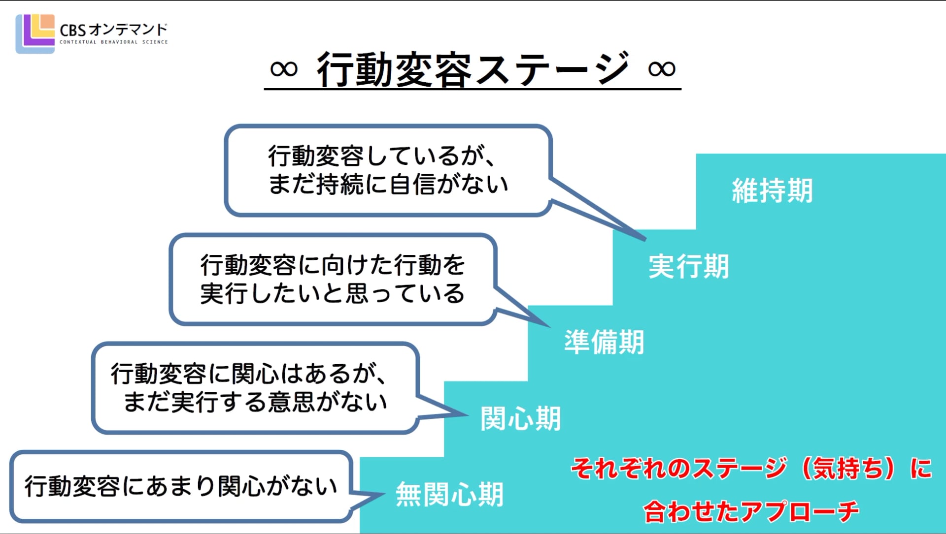 自分が子どもだった頃、あるいは子育て中の方はわが子を思い出してください。宿題をやる気持ちに切り替わっていないときや「やらなきゃ」と思っているときに「早く宿題をしなさい」と言われて、ムスッとしていませんでしたか。このように「実行したいな」と思っている段階で「やりなさい」と言われると逆効果になる可能性があります。ですから、行動変容のためにはそれぞれのステージに合わせたアプローチが重要です。