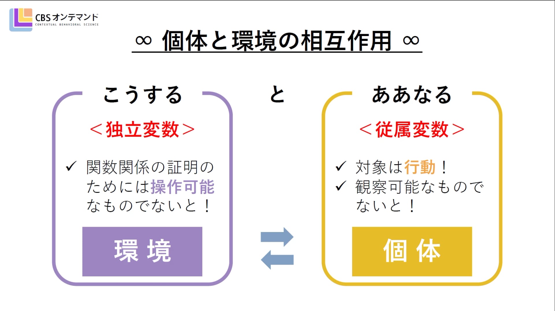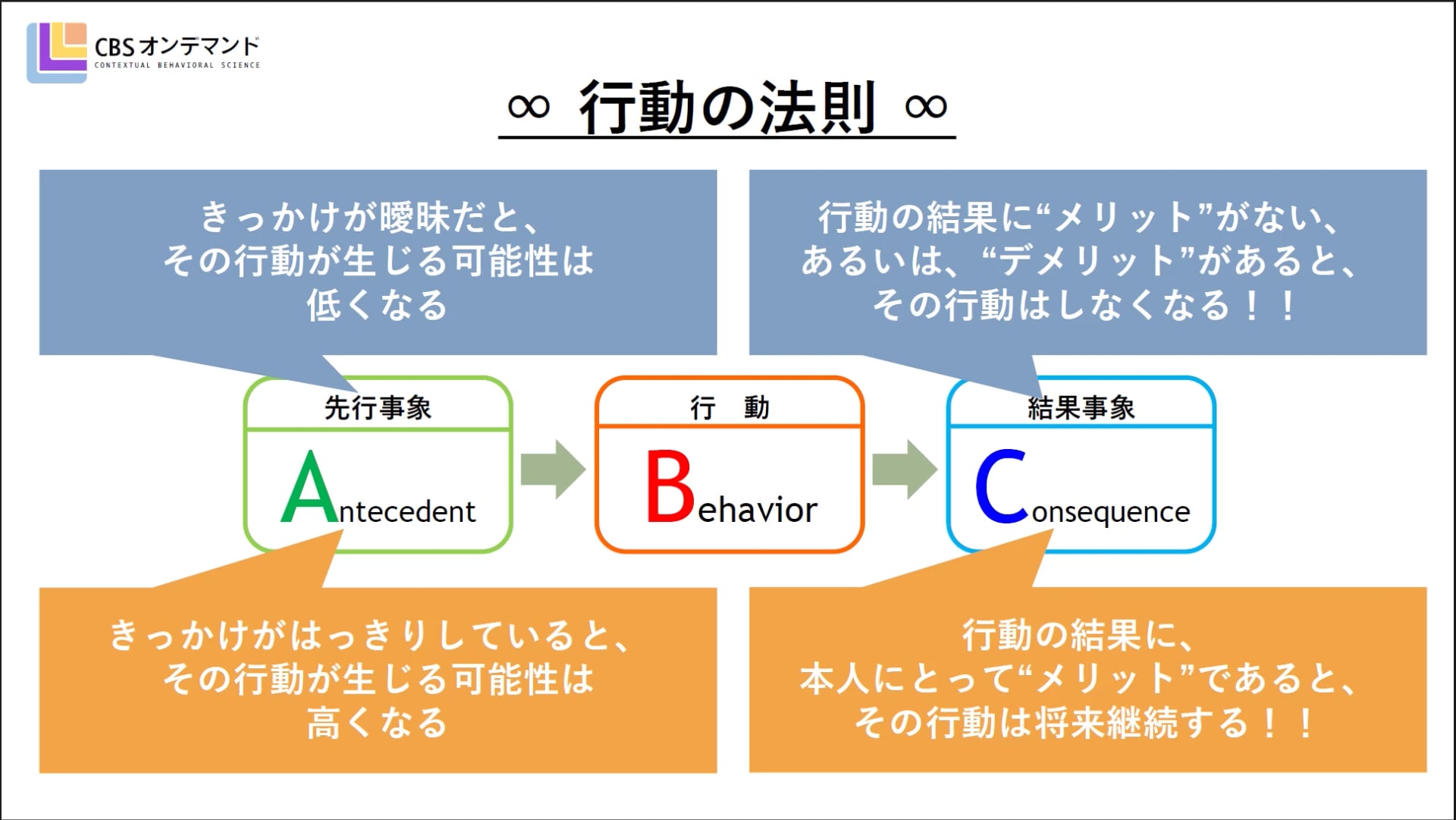 行動分析学は、行動の予測と制御を目的とする学問です。もっとひらたく言うと「こうすると、ああなる」というように、行動と結果の関係(関数関係)を、科学的に明らかにしていこうとする分野です。つまり「どうすれば人は行動を起こすのか」「どうすれば続けられるのか」「なぜやめてしまうのか」といったことの原因は「個体(人や動物)」そのものの中ではなく個体と環境とのやりとりの中で生まれると考えます。