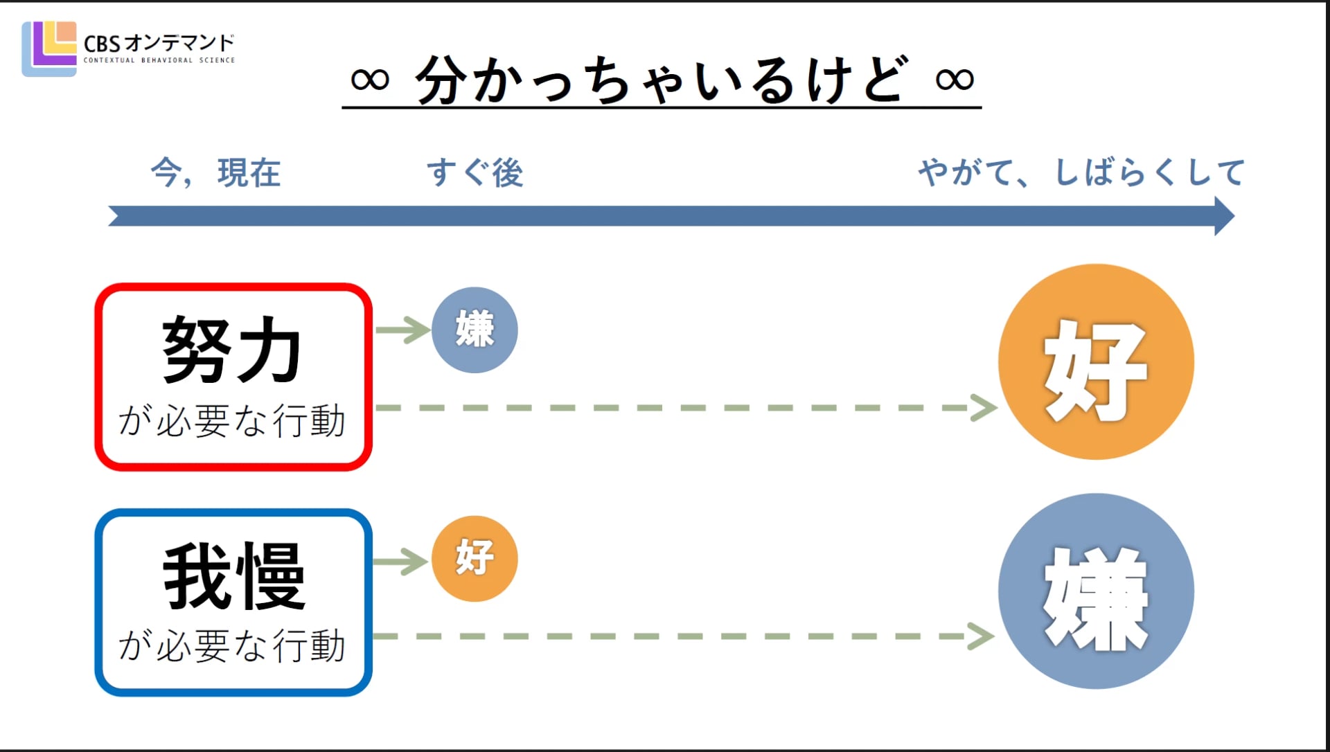 しかし、メリットやデメリットといった視点には注意するポイントがあります。例えば、タバコを吸うと健康を損なうリスクがあると知っていてもやめられない人はいます。逆に、運動が体に良いとわかっていても続けられない人もいるでしょう。これは人間の心理の特徴によるものです。運動や禁煙のように「努力が必要な行動」は効果(メリット)がすぐに得られず、タバコや甘いものなど「我慢が必要な行動」は、すぐに快楽(メリット)が得られる。このように「すぐに得られるか、後から得られるか」という時間のずれが、行動を左右するのです。