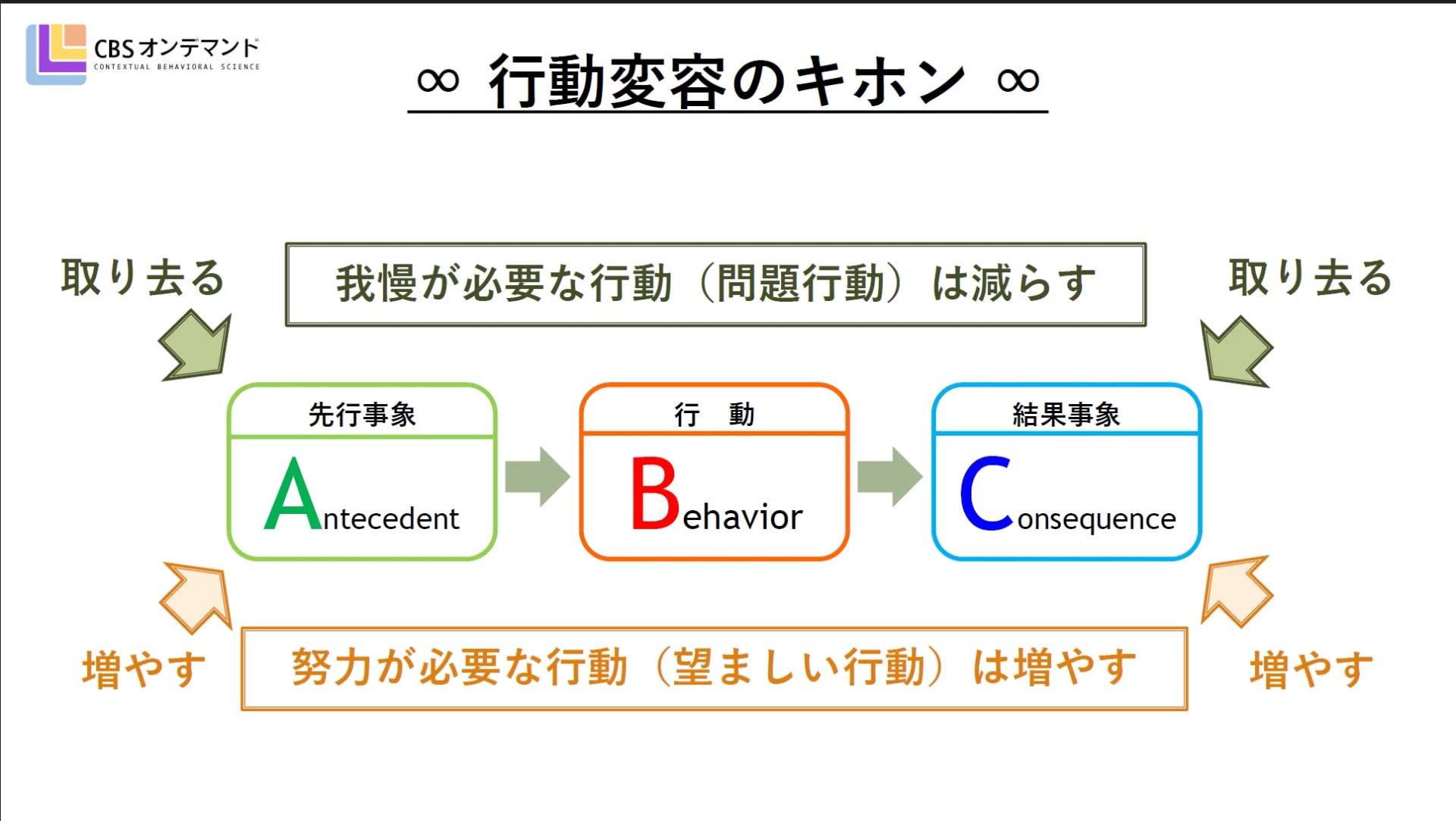 また、行動を変えるときの基本的な考え方として「我慢が必要な行動を減らす」ことと「努力が必要な行動を増やす」ことがあります。