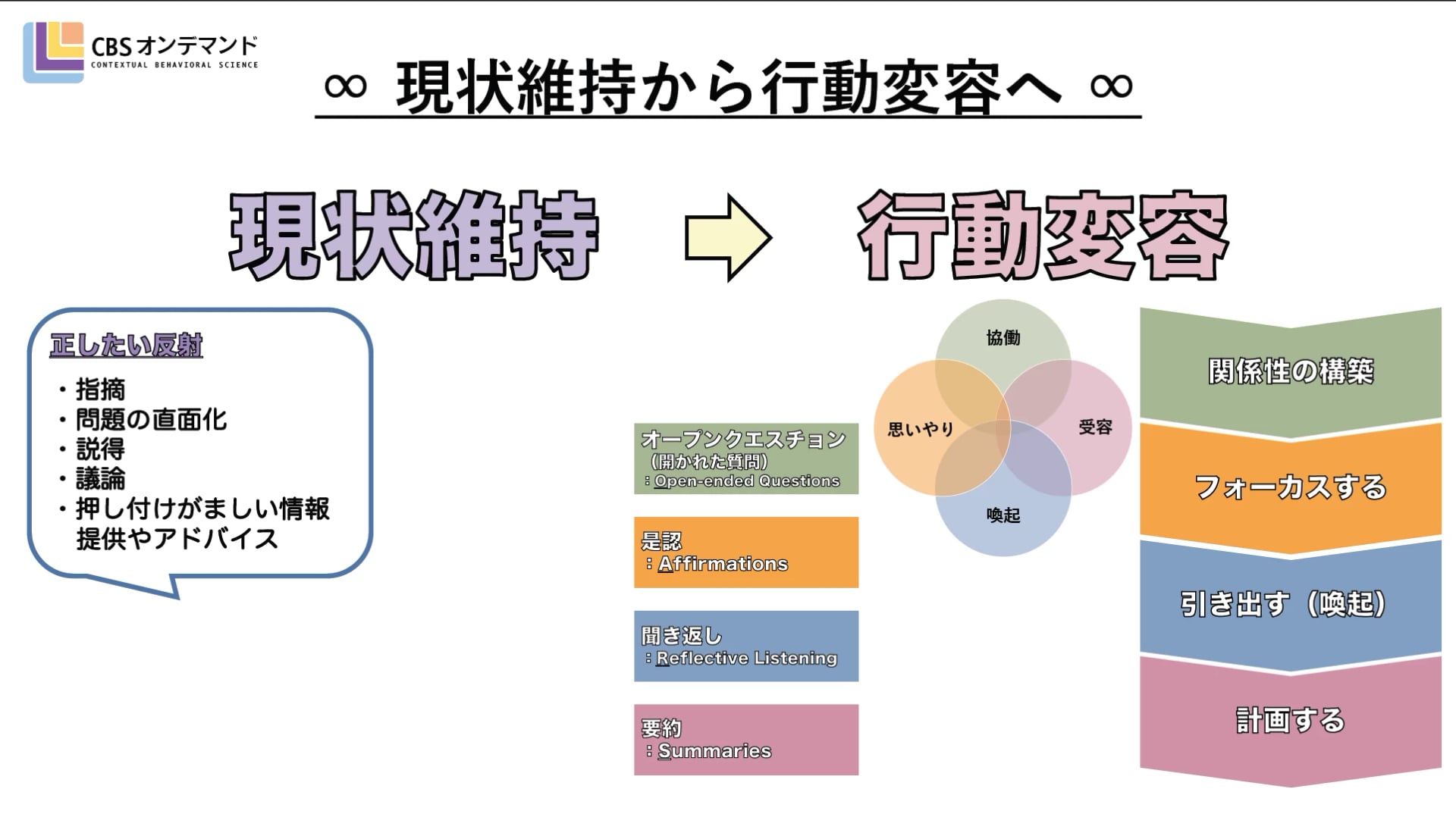 繰り返しますが、行動を計画する際にはその人の心に重点を置くのは逆効果です。また「正したい反射」と言われるような指摘や押し付けがましい情報提供にも気をつけましょう。そこで動機づけ面接では、指摘や説得ではなく「共同的なスタンス」を重視します。相手を否定せず、受け入れ、思いやりを持ち、相手自身の中にある「変わりたい気持ち」を引き出していく。そのための基本的な態度が次の4つです。