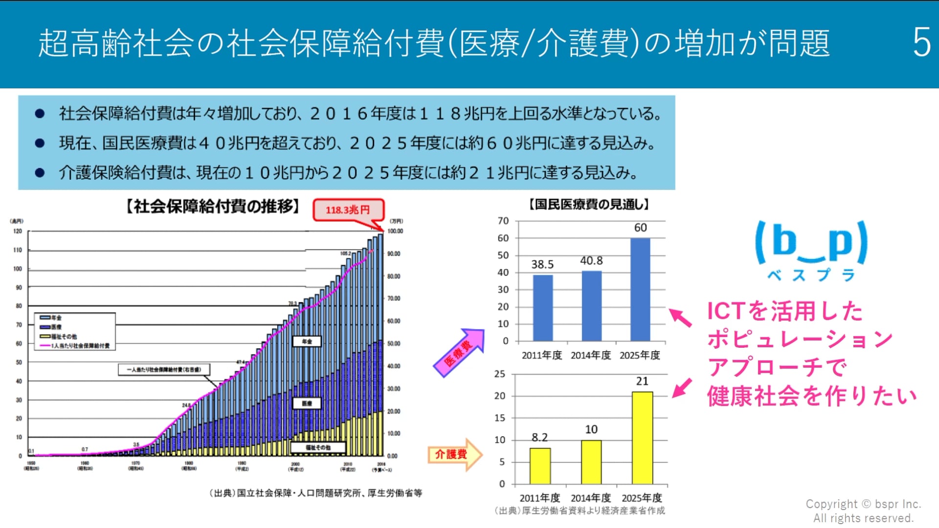私たちが取り組んでいるのは、超高齢社会における医療費・介護費の増大という大きな課題です。日本では、今後さらに高齢化が進み、医療や介護にかかる社会保障費が増えていくといわれています。この構造的な課題を、私たちは「ポピュレーションアプローチ」(地域全体の健康づくり)によって解決していきたいと考えています。