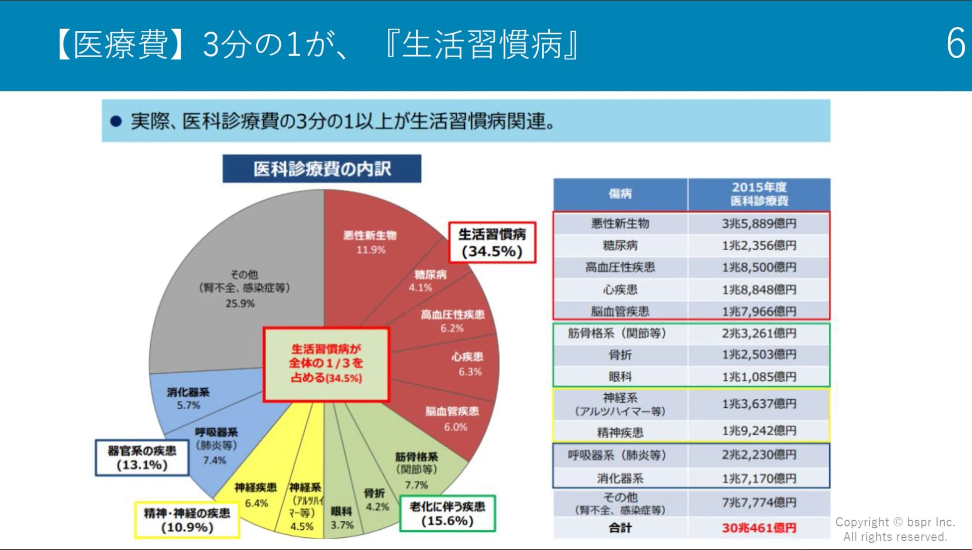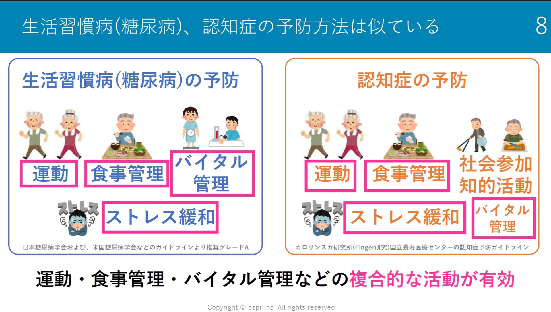 医療費の約3分の1は生活習慣病が占めている一方、介護費の最大の原因は認知症だといわれています。これらの予防のポイントは「運動」「食事」「バイタル管理」といった複合的な活動を継続することです。