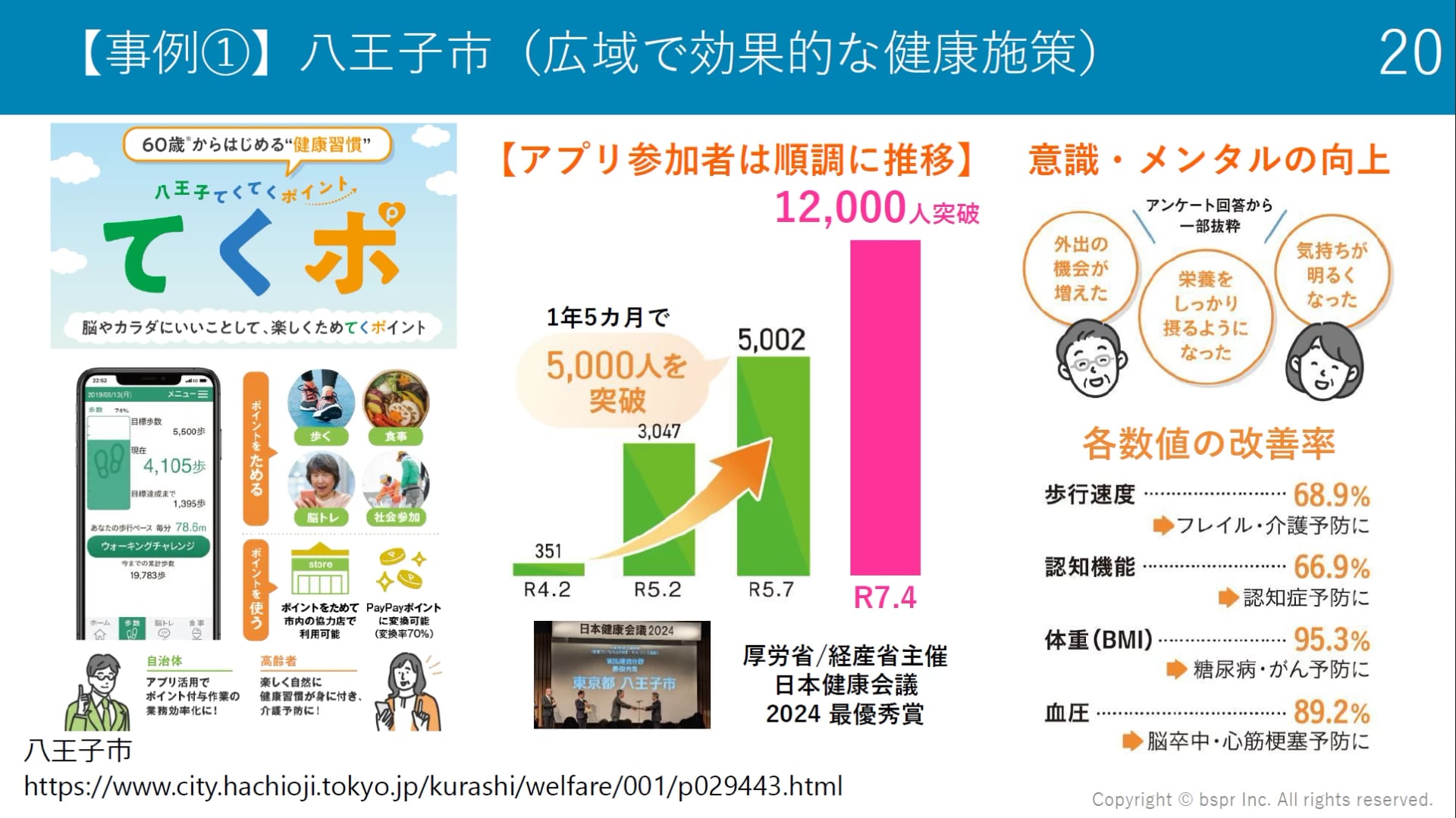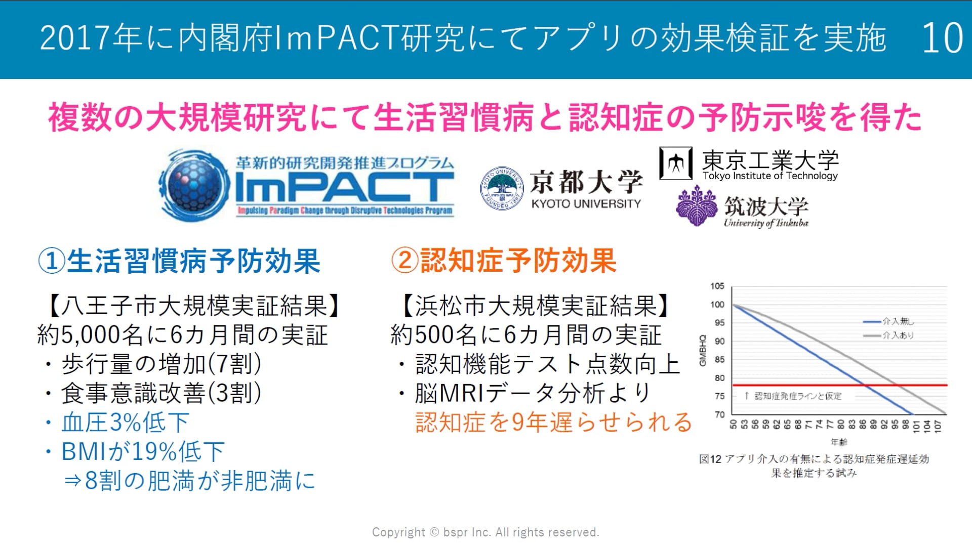 八王子市と実施した実証で、約5000人を6カ月追跡したところ、アプリ利用者は血圧やBMIが有意に改善しました。