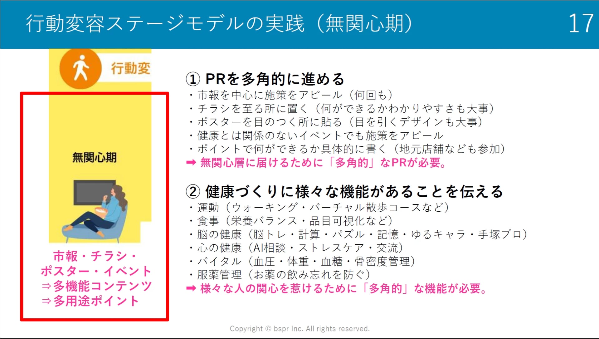 先ほど大月先生からお話があったように、私たちも「無関心期」「関心期」「準備期」「実行期」「維持期」は大事な考え方だと思っています。しかし、これを実際に落とし込むのは本当に大変です。まず、無関心期の人を動かすには、気づいてもらう必要があります。ここでは、市報やチラシ、ポスター、イベントといったタッチポイントを、いかに多く設けるかが最初のポイントです。多機能・多面的なコンテンツを用意し、できるだけ多くの人の興味に引っかかるようにしましょう。そして「どれか一つは気になるものがある」と思ってもらうことが最初のステップになります。