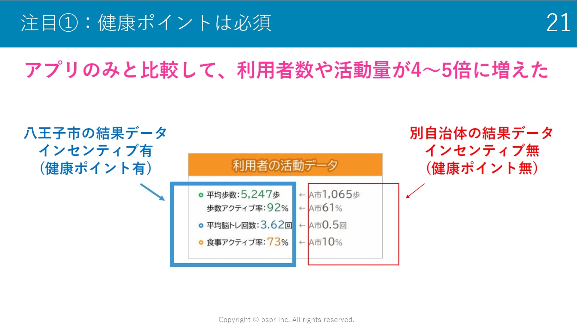 これらの結果から見えてきた成功のポイントは「インセンティブ」です。私たちは全国で複数の自治体と連携していますが「健康ポイント制度がある自治体」と「ない自治体」では、参加率・活動量ともに4~5倍の差が出ています。