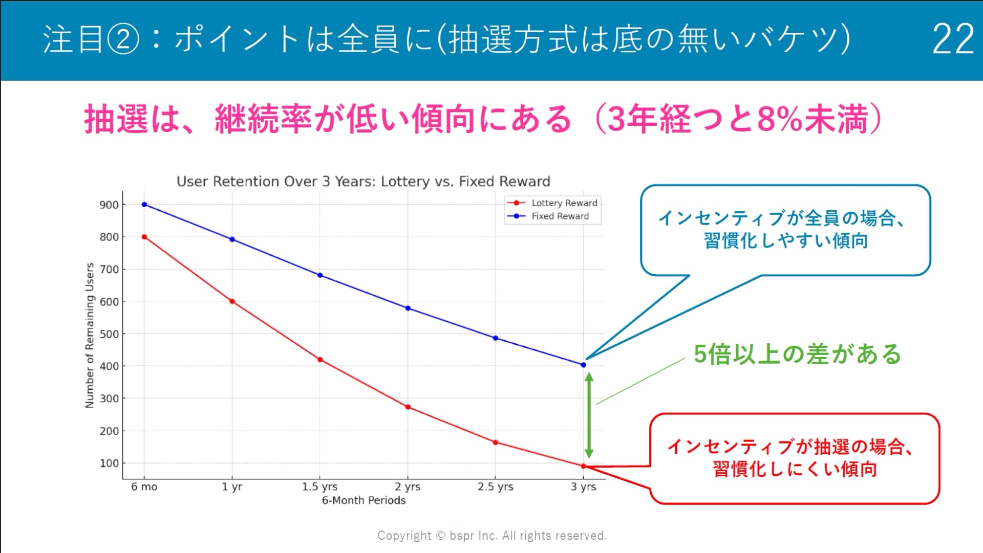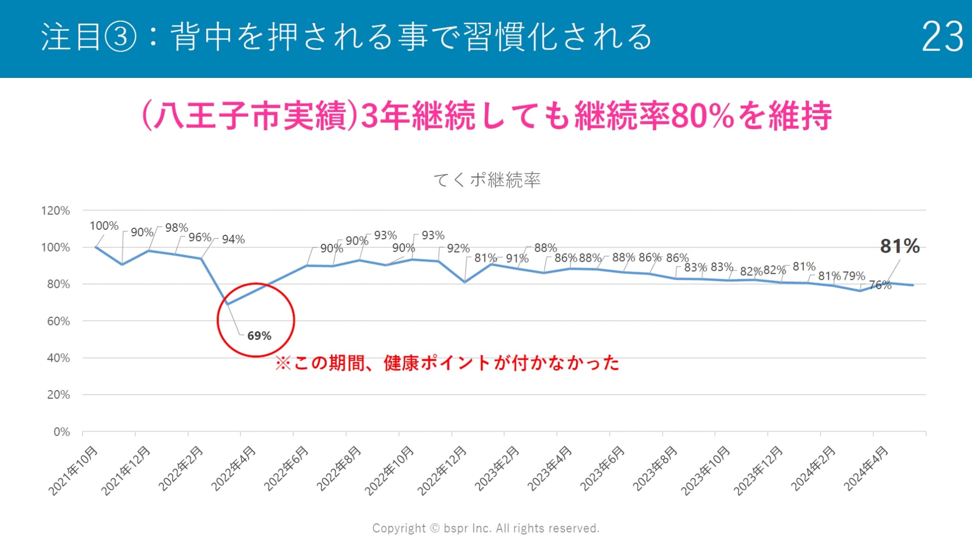 さらに、全員が確実にポイントをもらえる仕組みの方が、継続率が高いという結果も出ています。抽選方式の場合は3年後に継続率が8%まで落ち込むこともあり、「底のないバケツ」と言われることもあるほどです。一方、全員にポイントがつく方式では継続率が5倍以上に伸びます。実際に八王子市では、導入から3年以上経っても継続率は80%以上を維持しています。全員が成功体験を得られる設計が、「続けられる仕組み」につながっているのです。
