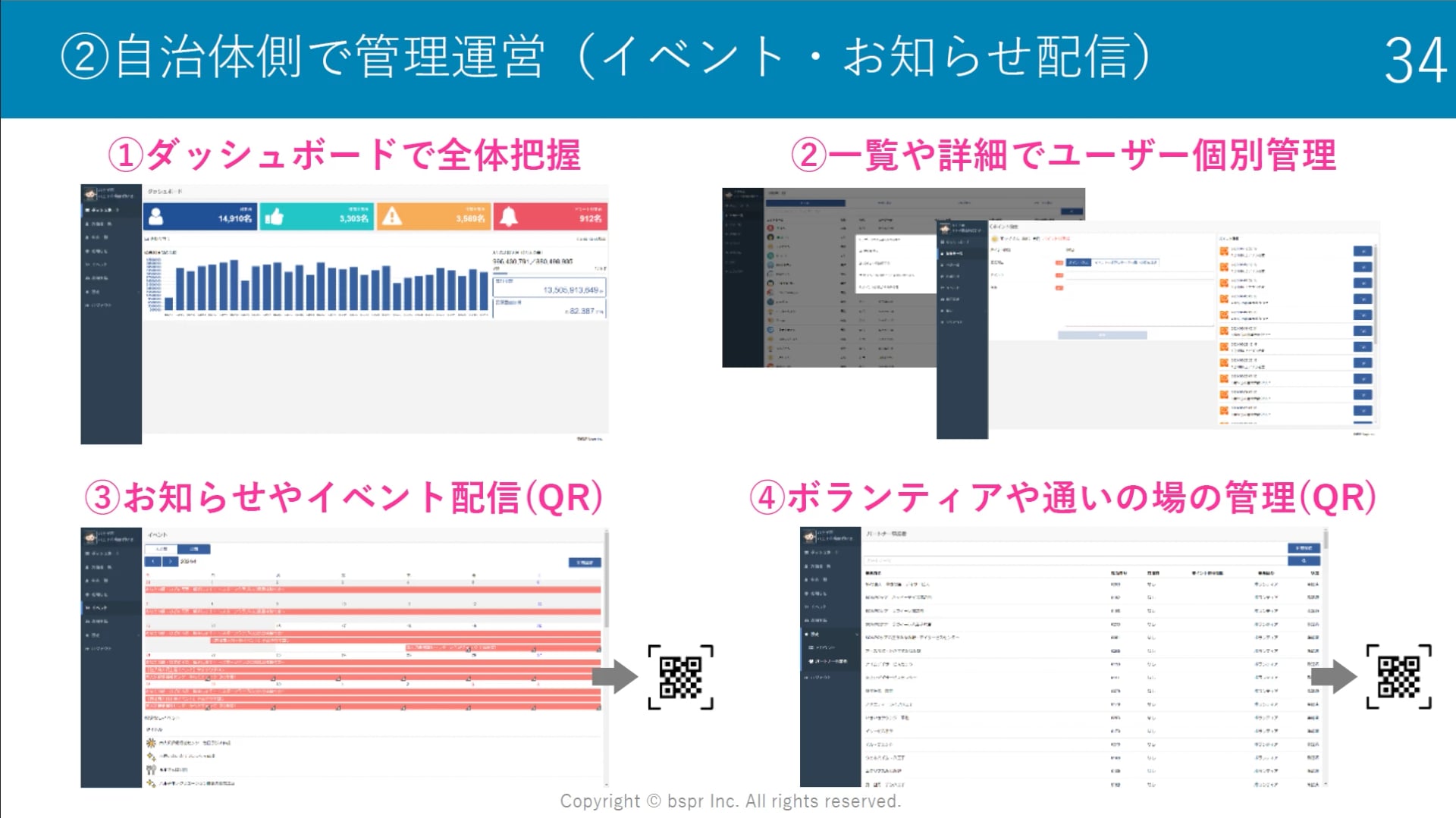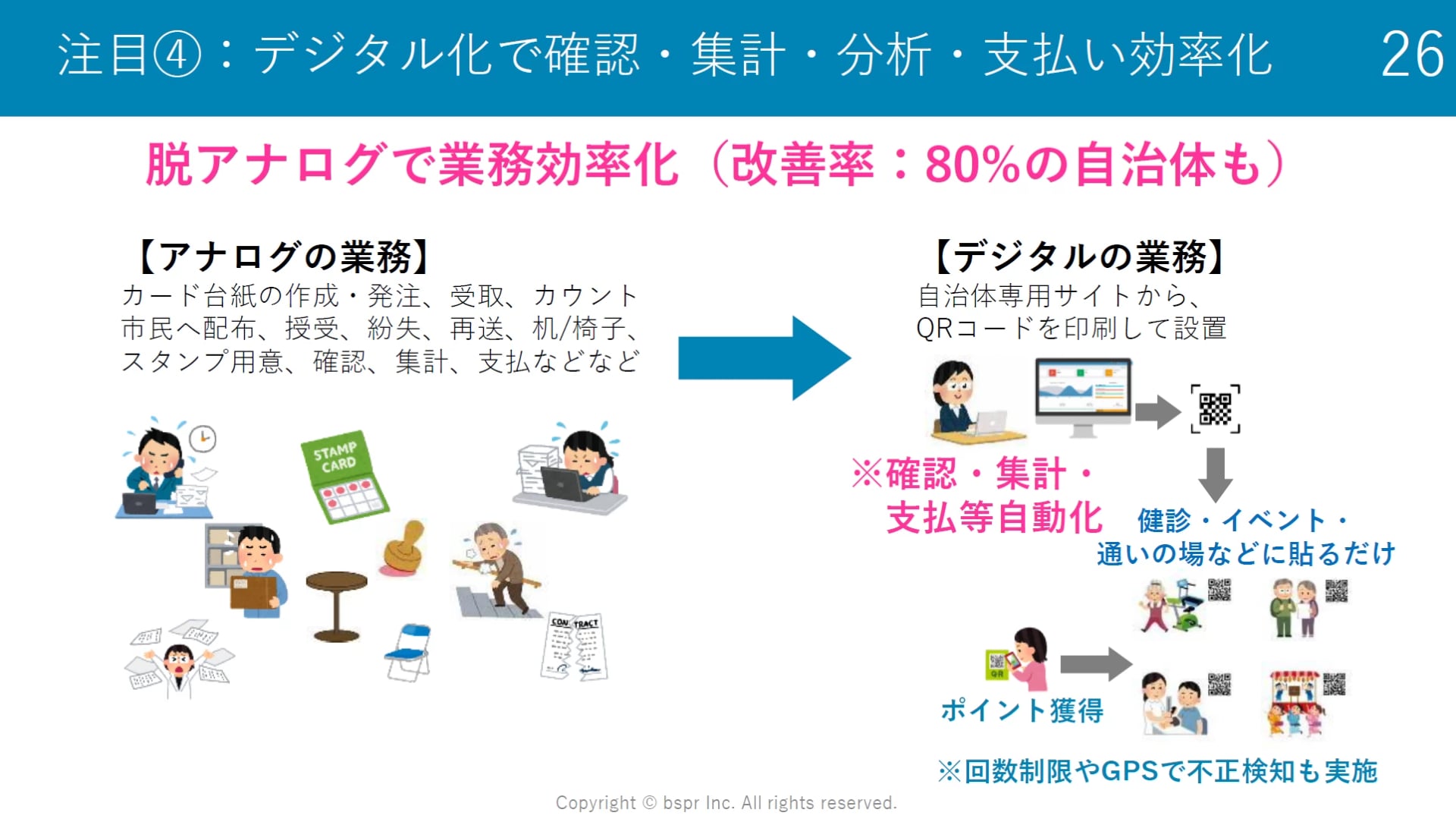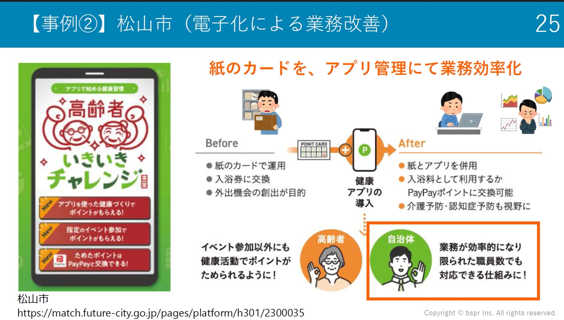 2つ目の事例は松山市です。松山市では、もともと紙のポイントカードを使って健康ポイント事業を行っていましたが、紙ベースの運用は負担が大きいということで私たちのシステムを導入。結果、業務が大幅に効率化され、限られた職員数でも対応できるようになりました。