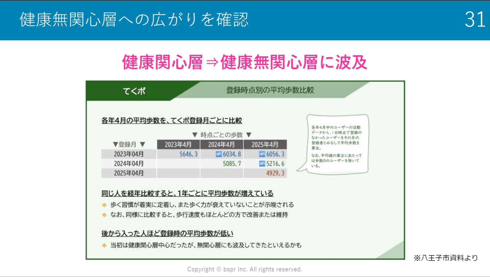 やはり「多角的な健康DX」こそが、地域の店舗や団体も巻き込む“まちぐるみ”の健康づくりの成功に欠かせないと感じます。八王子市でのデータを見ると、初年度は「歩く」参加者が多かったのですが、3年目には「普段あまり運動しない人たち」──つまり無関心層へと参加が広がっていました。周囲の盛り上がりが波及し、「自分もやってみよう」という意識が生まれた好例です。また、3年続けた結果、介護費が1人あたり約7000円削減されたというデータも出ています。私たちのサービスコストは1人あたり2000円程度なので、実質5000円の社会的効果がある計算になります。こうした仕組みを広げていくことで、健康増進だけでなく社会保障費の平準化にもつながっていくのです。