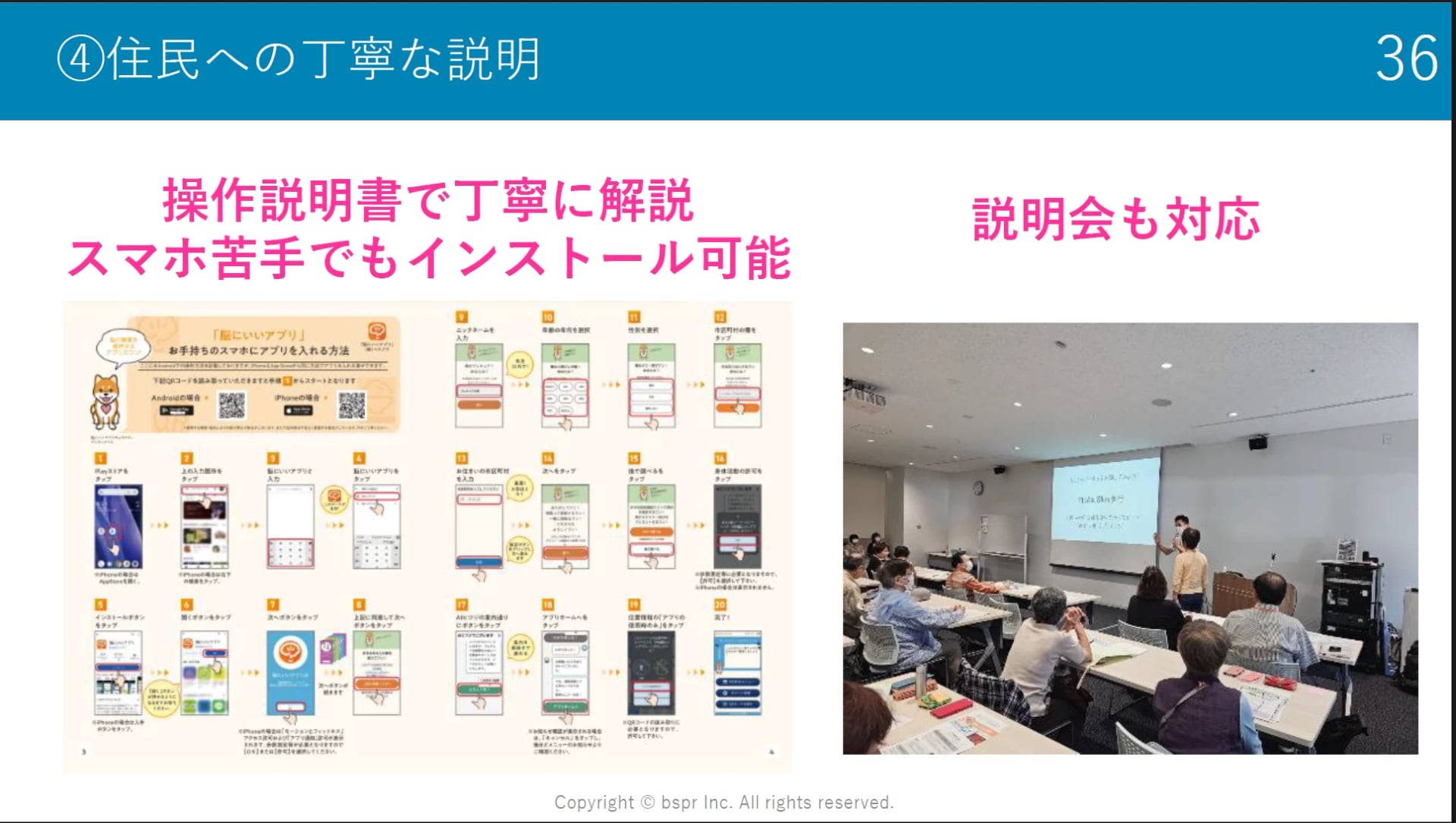 三木市にはスマホの操作が苦手な方も多くいらっしゃいます。特に最初の導入の「入口」でつまずいてしまうと、せっかくの機会を逃してしまいます。そこで市では、あらゆる機会を捉えてスマホ弱者へのサポート体制を整えました。このサポートは、健康福祉部門とデジタル推進部門の共同体制で実施しています。例えば職員が現場へ出向き、イベントや講座、説明会などあらゆる場で操作サポートを行い、利用のハードルを下げることで、参加への背中を後押ししています。こうした地道な取り組みの積み重ねによって、アプリの広がりは行政主導ではなく、市民同士の口コミによるものが大きいと感じています。