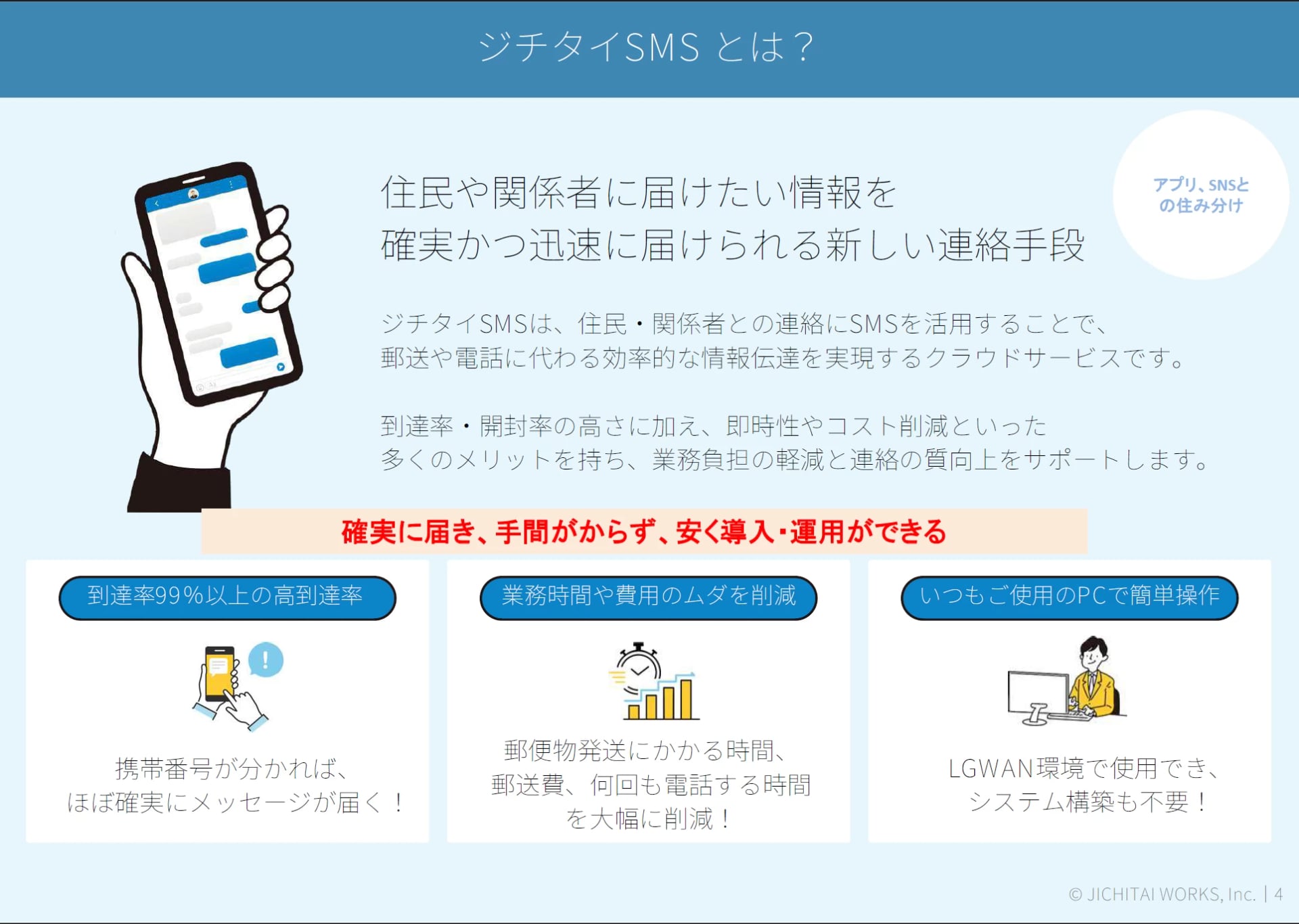 「ジチタイSMS」のポイントは3つ。1つ目は、確実に届くということ。到達率はなんと99%以上です。2つ目は、手間がかからない・コストを抑えられるという点です。郵送や電話対応に比べ、作業時間も費用も大幅に削減できます。3つ目は、普段お使いのパソコンから簡単に操作できるということ。LGWANにも対応していますので、セキュリティ面も安心です。