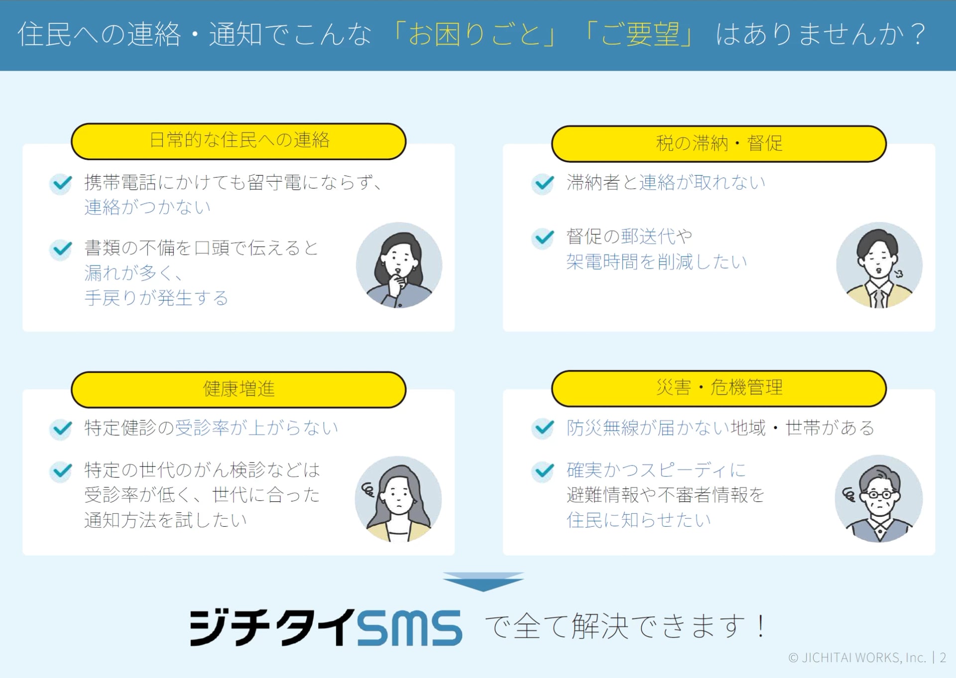そんな「ジチタイSMS」を多くの自治体様が導入してくださっているのは、やはりあらゆる課題を解消できるからでしょう。