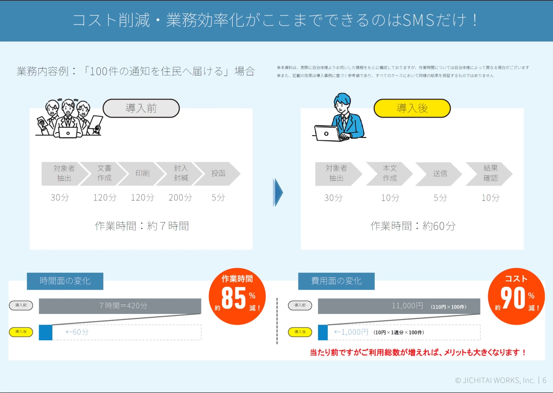 「100件の通知を住民へ届ける」場合、これまでは全てが手作業で作業に約7時間かかっていました。ところが、SMS導入後、作業工程がぐっと減り、たったの1時間で完了するようになりました。