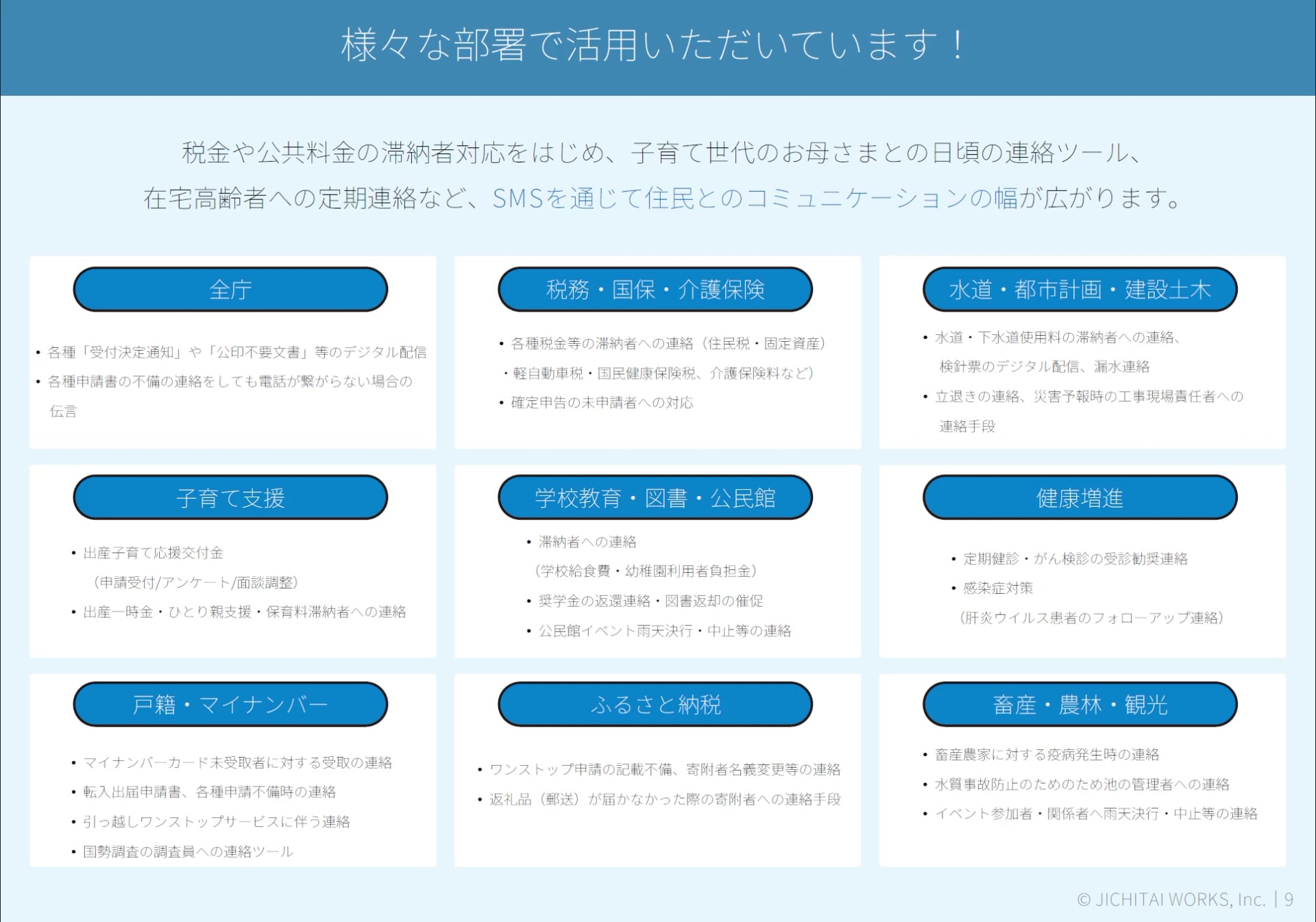 「実際にどんな業務で使えるのか」ということが気になるところだと思いますが、これまで郵送や電話で行っていた業務であれば、ほぼ全てSMSに置き換え可能です。業務の種類を問わず、さまざまな場面で使えるのが「ジチタイSMS」なのです。