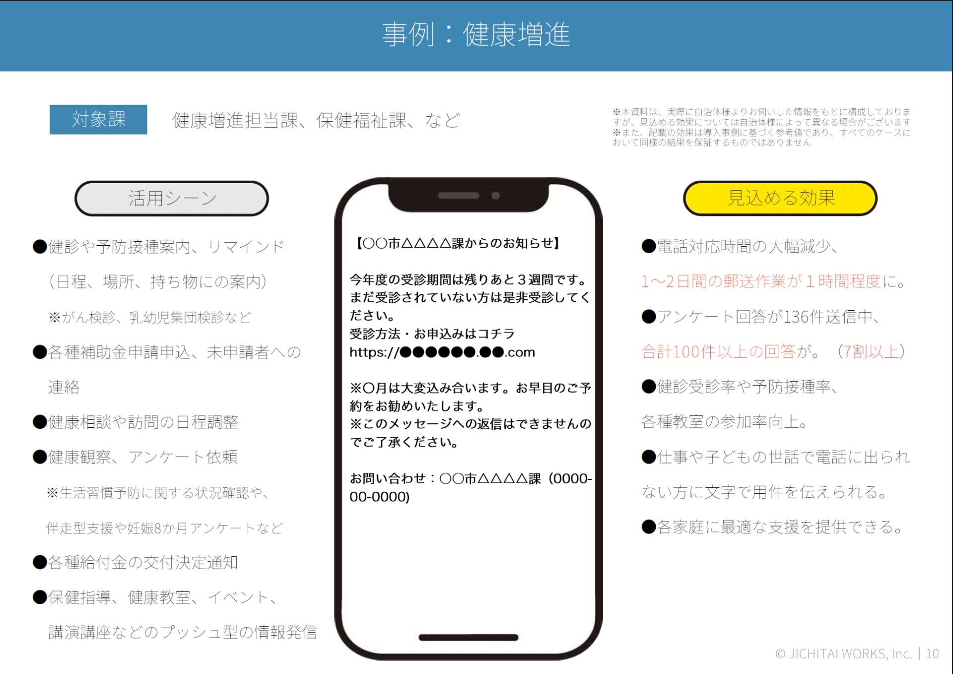 もちろん「健康増進」にも導入できます。例えば「受診期間はあと3週間ですよ」といった形で、タイミングを逃さずリマインドができます。さらに、申請手続きのご案内や未申請の方へのフォロー連絡、アンケートの送付や状況確認など、さまざまなケースに活用できるのです。