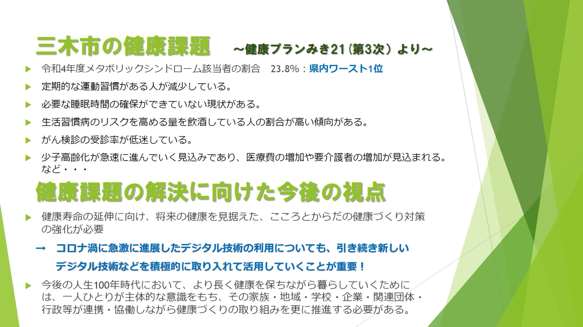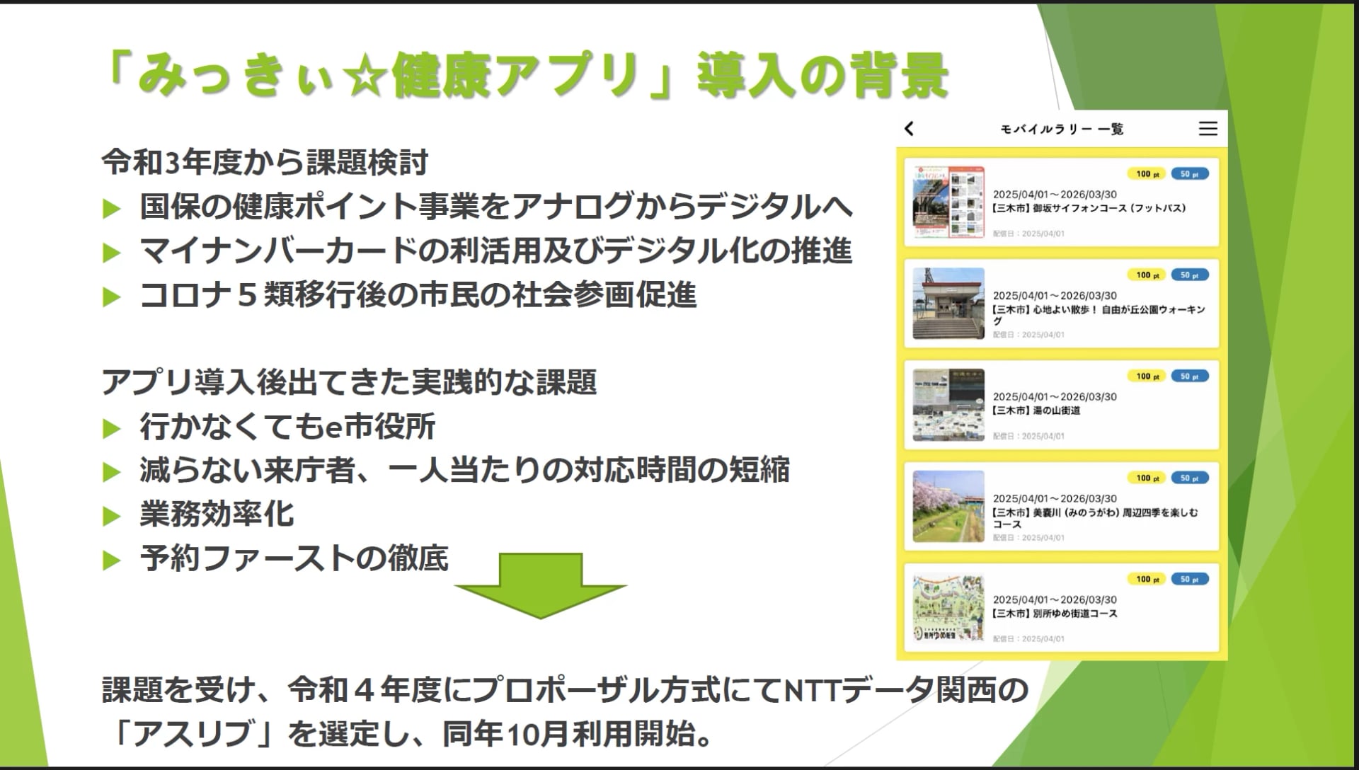 令和3年度から、従来の紙による健康ポイント事業をデジタル化し、マイナンバーカードの利活用を進める取り組みを始めました。また、コロナ禍以降、社会参画の機会が減ったことや、特定健診の受診率が低いという課題もありました。そこで、マイナンバーカードの個人認証機能を活用して、三木市民であることを確認できるアプリの導入を決定。これが、「みっきぃ☆健康アプリ」導入の背景です。