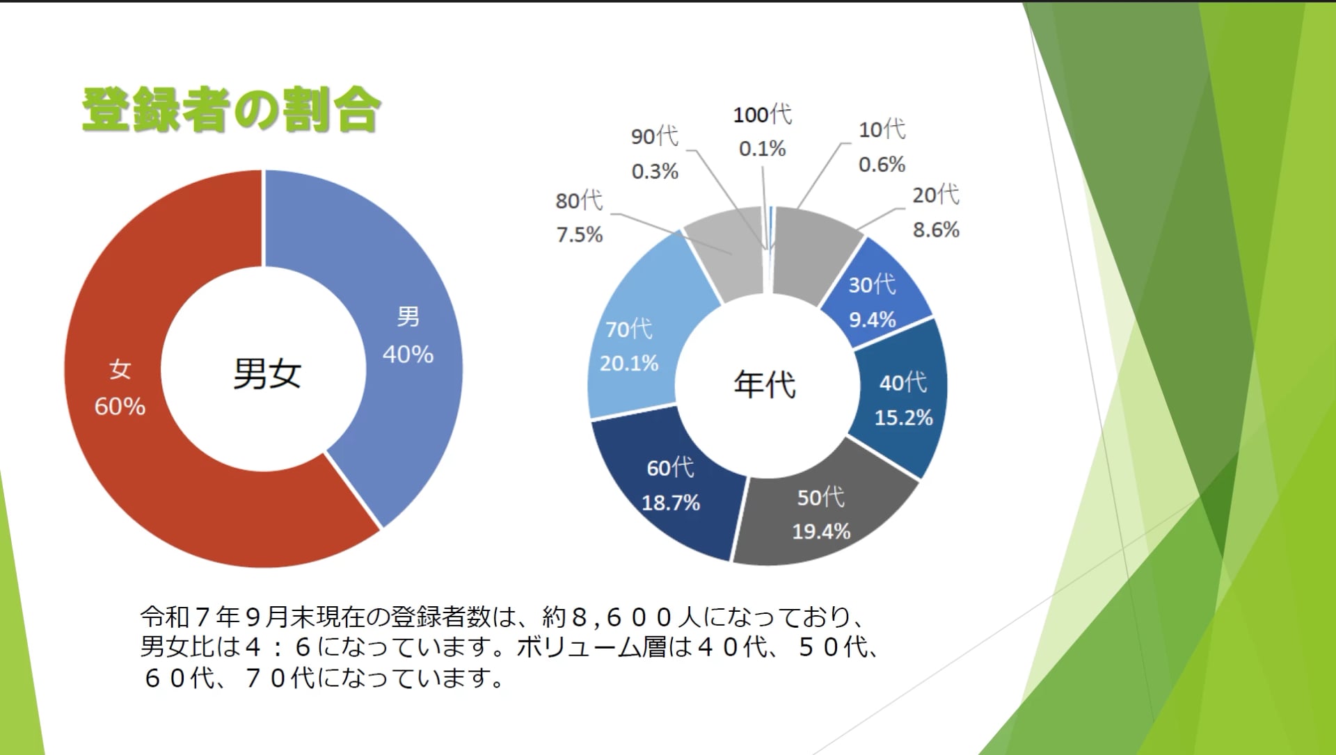 令和7年9月末時点で、登録者は約8600人。男女比は男性4:女性6で、女性の割合がやや多くなっています。年代別では70代が最も多く、続いて50代・60代となっています。