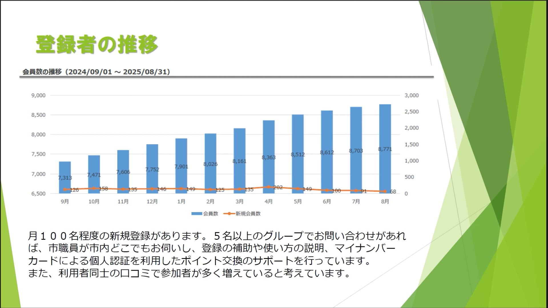 現在も月に約100名ペースで登録者が増加しています。令和7年度の登録者目標は8500人を達成し、来年度(令和8年度)は1万人登録を目指す計画です。