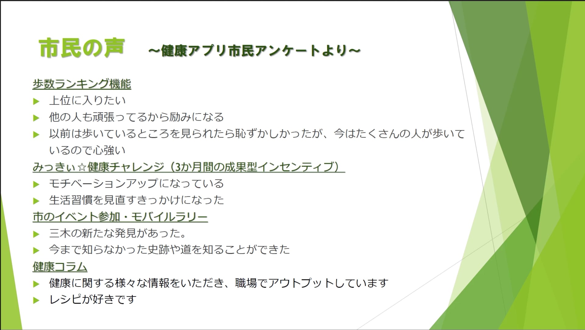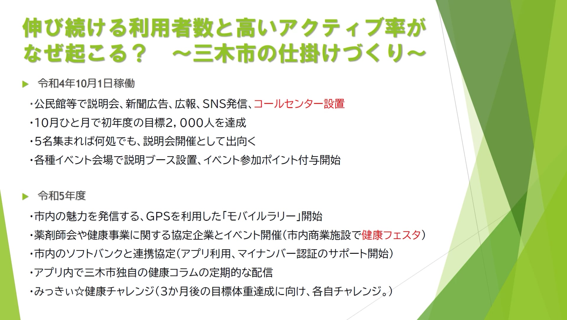 最後に、三木市が目指す未来についてお話しします。「みっきぃ☆健康アプリ」事業は、今年10月で3年目を迎えました。今後は大学と連携し、アプリ事業と健康データを照らし合わせた効果検証を行う予定です。その分析結果から見えてくる健康課題にもとづき、アプリを活用した新しい健康づくりの施策を展開していきます。そして、これからもデジタル推進と健康づくりを両輪として進め、「行かなくてもe市役所」の実現、市民の健康寿命の延伸に向けて、市民の皆さんとともに歩んでいきたいと考えています。