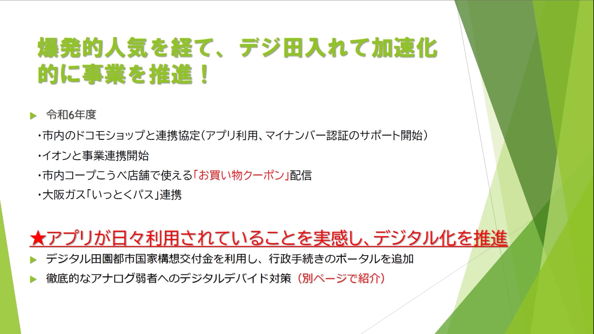 令和6年度からの新たな取り組みをご紹介します。この年度には、市民の方々のアプリへの期待が高まっていることを感じ、企業との連携をさらに強化しました。例えば、携帯ショップでの操作サポートや、お買い物時に使えるクーポン配信などを行っています。また、デジタル田園都市国家構想交付金を活用し、アプリのポータル画面に新しいボタンを追加しました。そこから電子申請や健診予約システムへ直接アクセスできるようになり、市公式アプリと連携し、毎日利用されるアプリだから実現できた内容です。