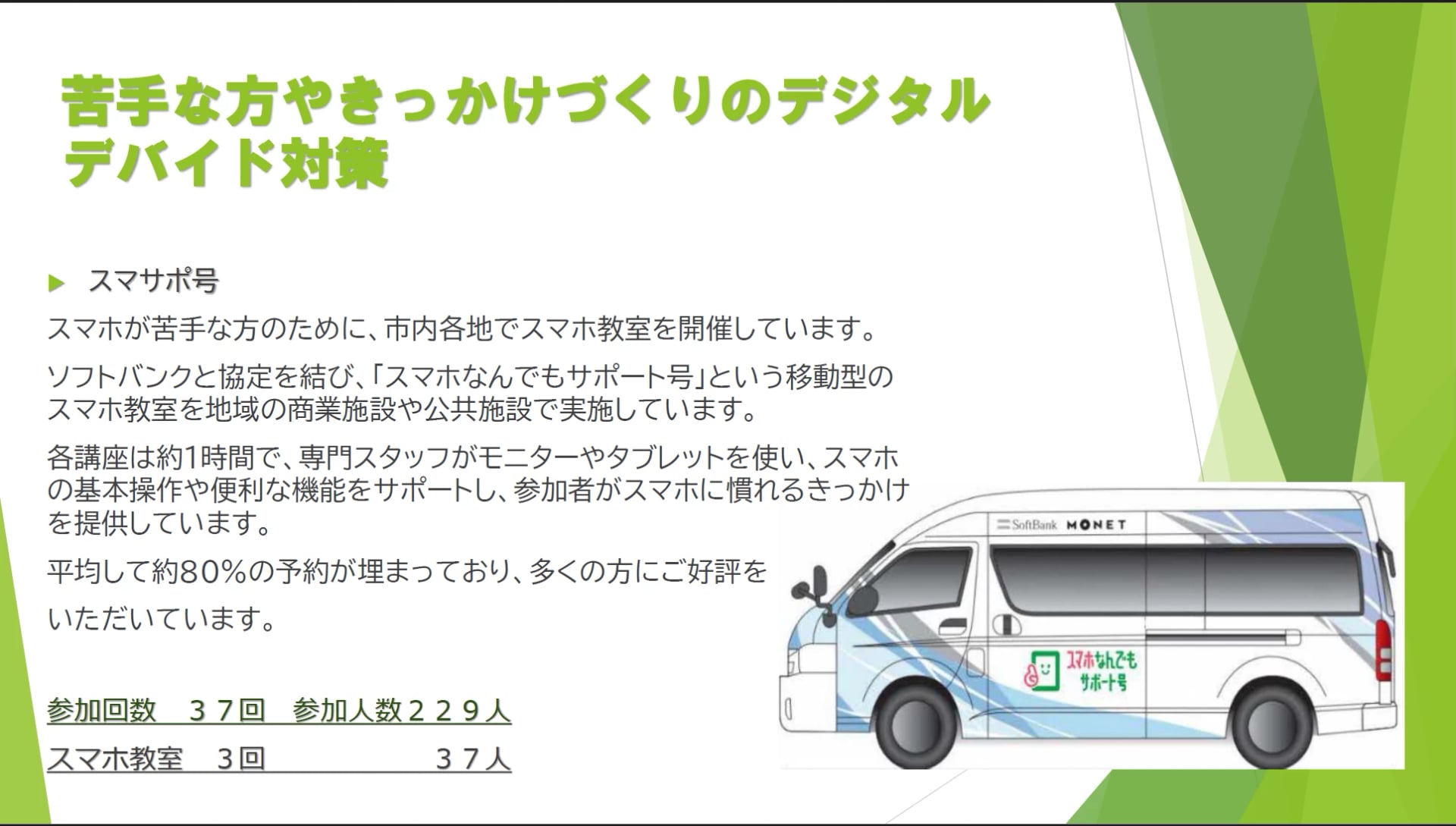 一方で、DXを進める上で避けて通れないのがデジタルデバイド対策です。三木市でもこの課題にしっかり向き合いました。これまで公民館で行っていたスマホ講座に加え、新たに「スマサポ号(スマホなんでもサポート号)」をスタートしました。これはソフトバンクとの協定により実現した移動型のスマホ教室です。