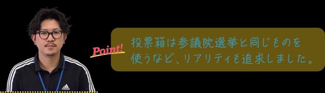 スムーズな運営を目指し、模擬選挙の投票場所は期日前投票所2カ所に限定。親が投票を終えた後にチラシと投票用紙を交換し、記入形式ではなく、候補メニューの投票箱を3つ用意して投入する方法をとった。「実際の選挙を妨げず、人の流れを滞留させないように工夫しました」と瀧澤さん。