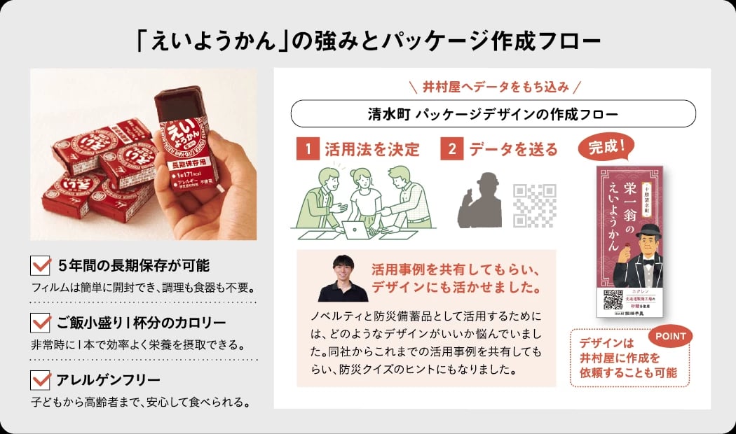 清水町では地域のPRを目的に、まちの記念式で来場者へ配布するノベルティに「えいようかん」のオリジナルパッケージ商品を取り入れた。常温で5年保存ができるため、防災備蓄品としても活用しているという。詳しい背景や経緯を聞いた。
