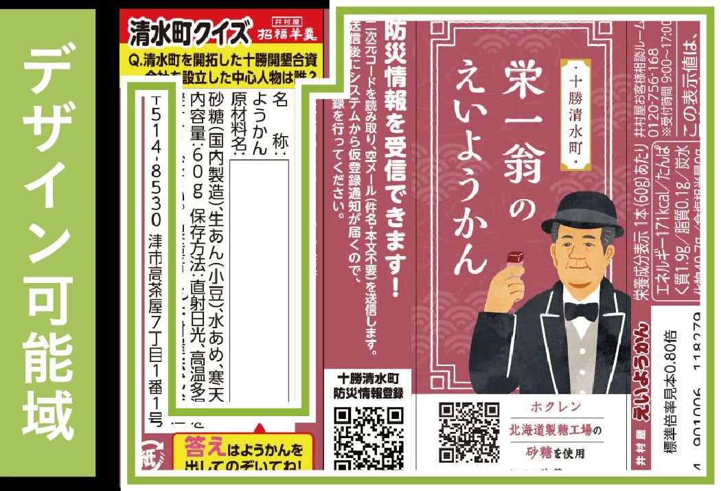 一方で、えいようかんを防災備蓄品として導入する自治体も多い。同町でも当初から、防災面での活用を視野に入れていたそうだ。「備蓄品の管理を行う総務課へえいようかんのことを伝えると、常温で5年保存ができるという管理のしやすさから、すぐに導入が決まりました」。そのためパッケージには、防災に関する工夫も凝らした。「側面には、防災情報メールの受け取りを登録できる二次元コードを載せました。また、裏面には防災クイズを印刷。ようかんを取り出すと答えが分かるしかけにして、見た人が楽しみながら防災意識を高められるようにしました」。