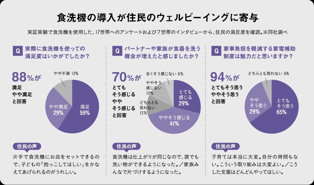 無料モニターには使用後にアンケートを行い、一部の家庭にはインタビューも実施。“夫が積極的に食器洗いをしてくれるようになった”“食洗機のおかげで時間と心にゆとりができて、子どもの手伝いを見守れるようになった”など好意的な意見が寄せられた。こうして、食洗機の導入が住民のウェルビーイングに寄与することを実感したという。