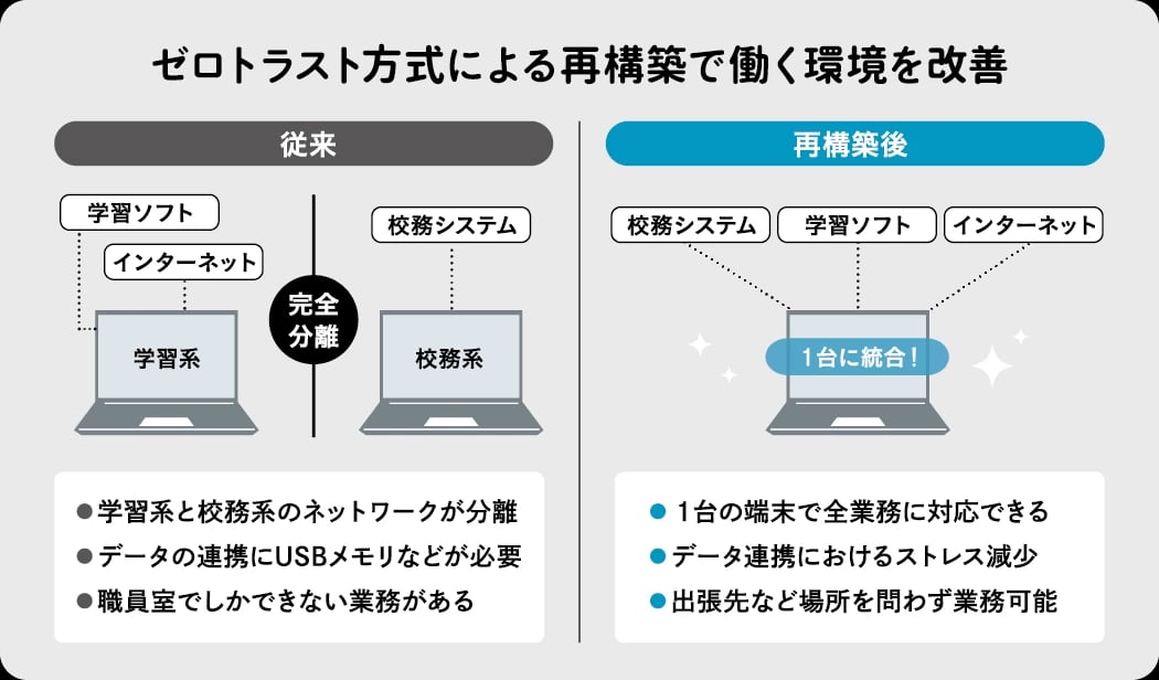 背景には、教職員の働き方を改善する意図があるようだ。「セキュリティ上の理由から、インターネットに接続可能な“学習系端末”と、外部アクセスが制限された“校務系端末”の2種類を使い分けていました。しかし、学習指導と校務は密接に関係しており、データの連携は不可欠です。そのため、USBメモリを使ってデータ移行するなどの手間が生じていました。また、個人情報を扱う校務系端末は、職員室など限られた場所でしか利用できず、残業の一因になっていたのです」と関根さん。