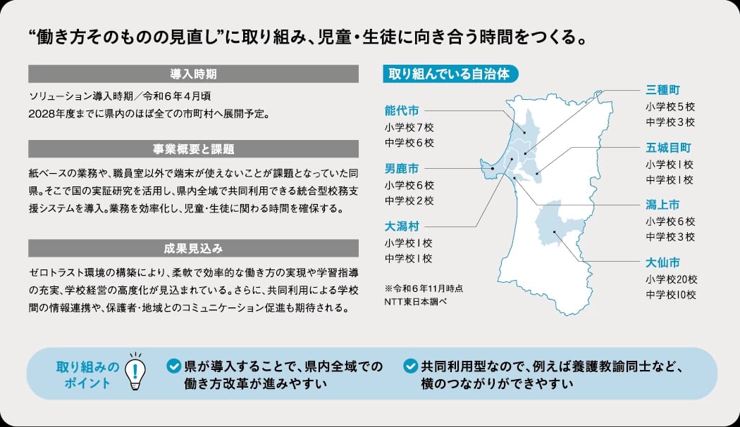 文部科学省では、誰もが幸せになる教育の実践を目指している。同省が描く未来像を達成するため、同社はICTで学校現場を支援。自治体や学校のニーズに応じたサポートを進めている。