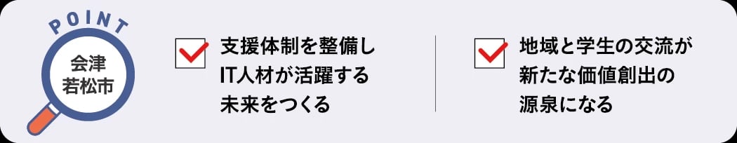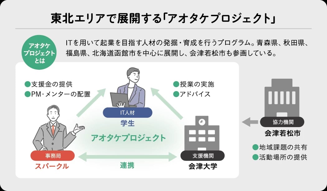 若い才能を地域で育てれば、課題解決や産業創出につながり、まちに光が差すだろう。会津若松市は、IT人材を育成する経済産業省の補助事業に採択された「アオタケプロジェクト」に協力。アイデアの社会実装を目指す若者を支援している。