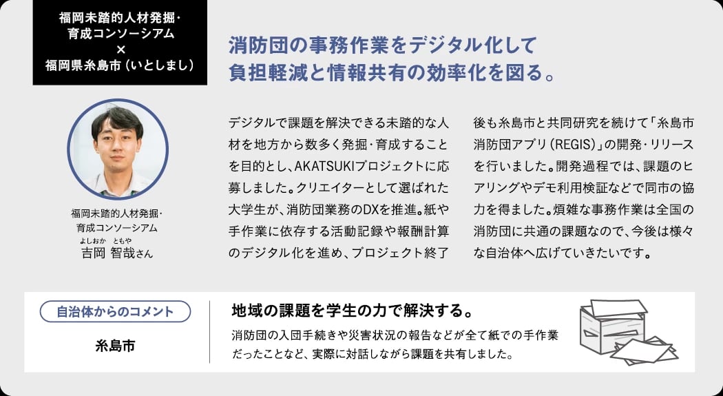 このような取り組みが評価され、令和5年、同社は経済産業省の「未踏的な地方の若手人材発掘育成支援事業AKATSUKIプロジェクト」に採択された。同プロジェクトは、地域に眠る才能の発掘・育成を目的に、同省が令和5年に立ち上げた事業だ。これまでも突出したIT人材を発掘・育成する「未踏事業」を長年実施してきたが、その育成スキームを継承し、地方へと展開。事業期間を通して経験豊富な指導者をプロジェクトマネージャー(以下、PM)やメンターに配し、研究・開発が円滑に進むようIT人材の挑戦を支える。