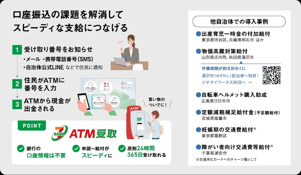 同サービスは、住民がコンビニなどに設置されているセブン銀行ATMに番号を入力するだけで現金を受け取れる仕組み。自治体・住民ともに同行の口座開設は不要で、原則として24時間365日受け取りができるという。「口座情報を確認せず支給まで進められるので、効率化につながると感じました。ATMの設置台数が多いため、住民にとっても利便性が高いと考えています」と横倉さん。