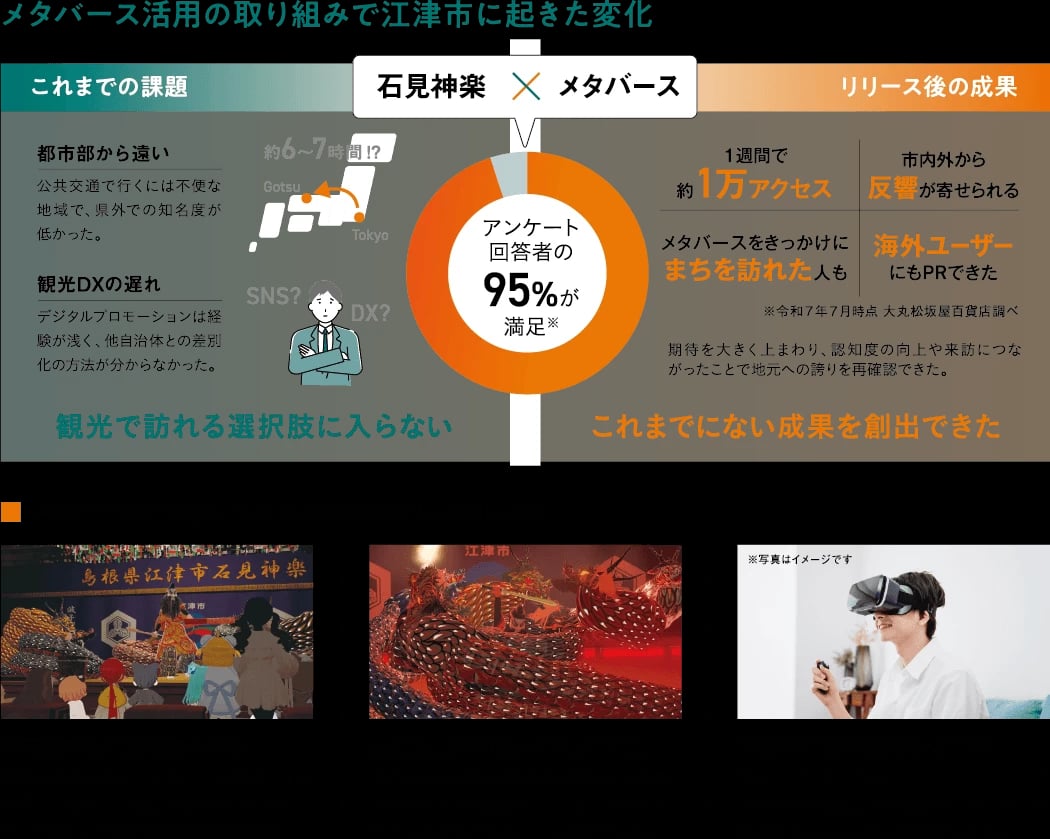 全国にはまだ広く知られていない文化や伝承が存在する。江津市で受け継がれる「石見神楽(いわみかぐら)」もその一つ。長い歴史をもちながらも、全国的な知名度が低い“地域の宝”を、臨場感はそのままに仮想空間で再現したという。