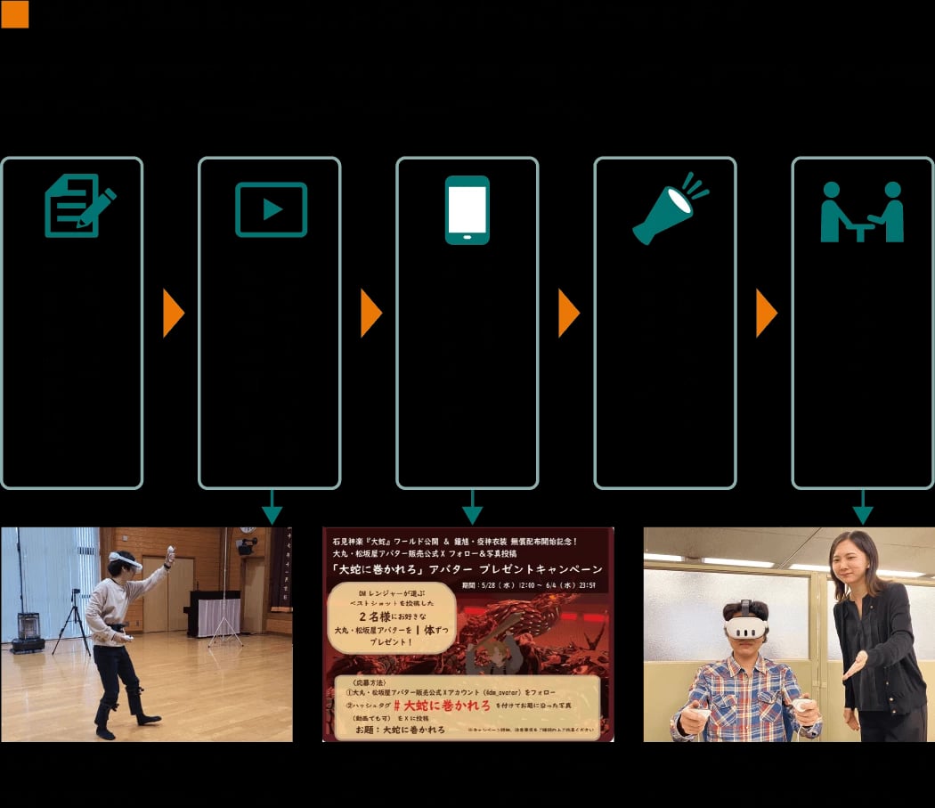地域の神楽団から協力を得て、人気の演目「大蛇(おろち)」の撮影を実施。人の動きを記録するモーショントラッカーで演者の舞を詳細に捉え、仮想空間上に再現していった。同時に各方面へのPRも開始。令和7年5月には“メタバース石見神楽”のβ版が完成し、動画を同社のYouTubeチャンネルで先行配信。その後、メタバースを公開した。