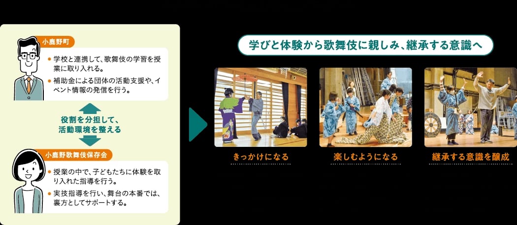 江戸時代から続く伝統芸能「小鹿野歌舞伎」を次世代に継承するため、学校教育や課外活動に“演技体験”を取り入れている小鹿野町。子どもたちが楽しさを知ることで、地域文化継承の土壌が育まれている。