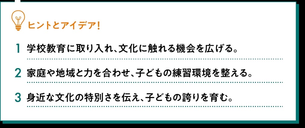 学校や地域と協力体制を築き子どもに文化の価値を伝える。
