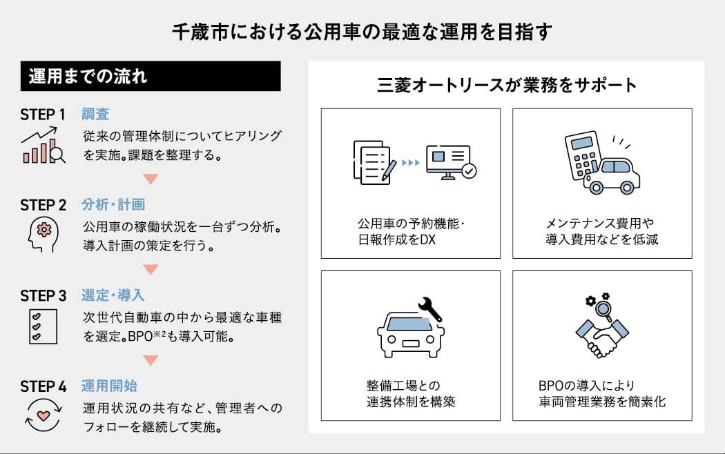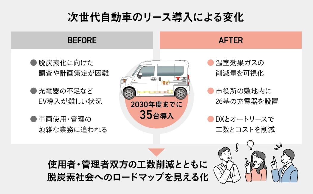 令和4年に「ゼロカーボンシティ宣言」を行った千歳市。公用車のEV導入の検討をきっかけに、車両管理の課題にも着目し、アウトソーシングを実施。長期的な視野が必要な脱炭素化において、成功のカギを教えてくれた。