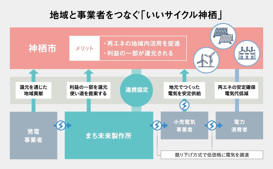 同社が提供する「e.CYCLE(いいサイクル)」は、自治体・発電事業者・小売電気事業者をつなぐ、再エネに特化したプラットフォームだ。発電事業者は同社へ電気を預け、小売電気事業者が競り下げ方式で調達する。こうして、電力消費者は適正な価格で再エネを利用できる仕組みだ。同社は売電利益の一部を積み立て、市はそれを地域活性化の原資として活用している。