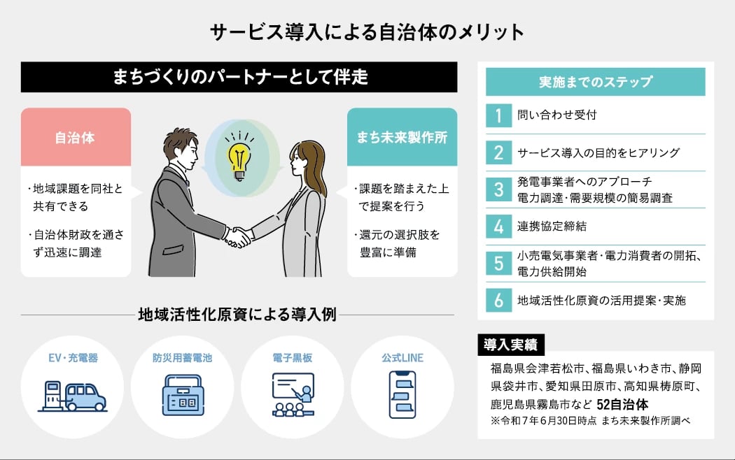 かつて、電気の地産地消を模索した時期もあったが、実現には至らなかった。「地域新電力の事業化も検討していましたが、燃料価格の高騰など将来的な不安を払拭できず断念しました。当時は電気を買った方が安く、高いイメージのあった再エネを導入するメリットが見出せなかったのです」。そんな中、平成30年に環境省経由で「まち未来製作所」を紹介されたという。