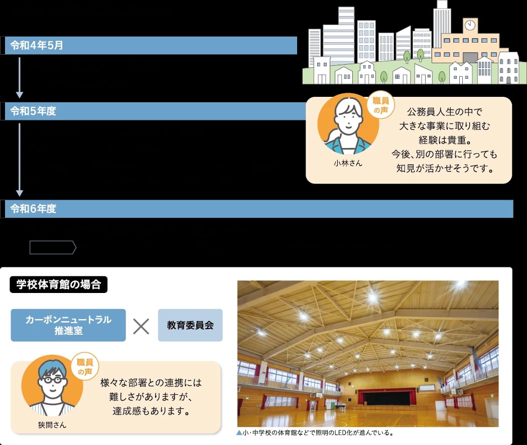 工事は当初の計画通りに進んでおり、来年度には全グループのリースが開始される見込みだ。この事業が始まる前に着工していた施設や、建て替え・解体を控えている施設を除き、全てでLED化が完了する。カーボンニュートラル推進室は庁内の関係者との調整役を担うため、業務負担が少ないわけではないが、やりがいは大きいという。発足以来、照明LED化を担当してきた狭間さんは、「最初は当市にとって最適な手法が分からず、難しさも感じました。しかし、関係部署と協力しながら成果を出すことができ、達成感があります」と、手応えを話す。
