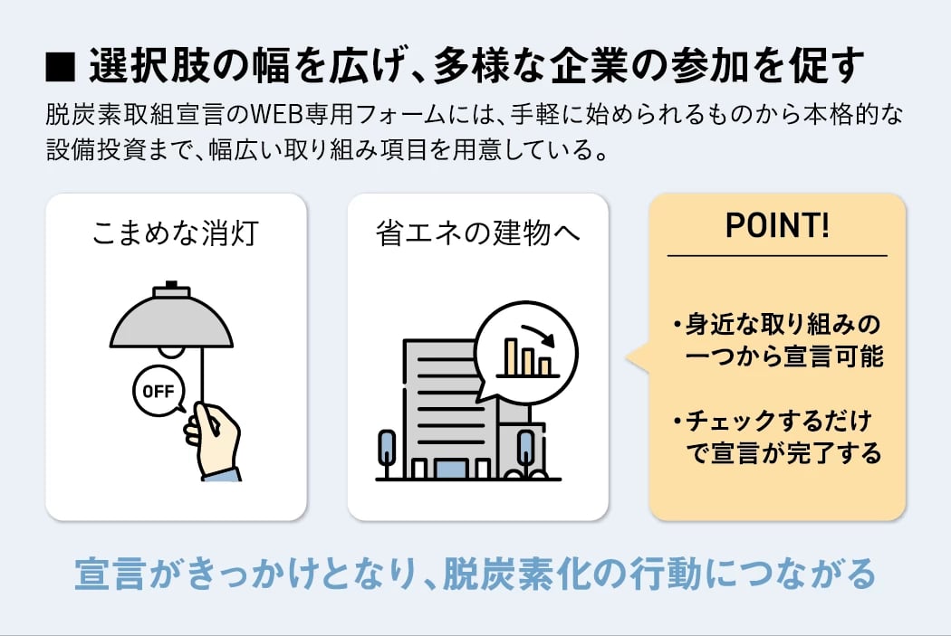 なお、以前は“何から始めていいか分からない”という企業も多かったが、宣言をきっかけに行動に移すケースが増加。エアコンの適切な温度設定や通勤時の公共交通機関の利用など、身近な取り組みから始めている。“電気代の削減につながった”“経営力の強化を実感している”といった声が寄せられているという。