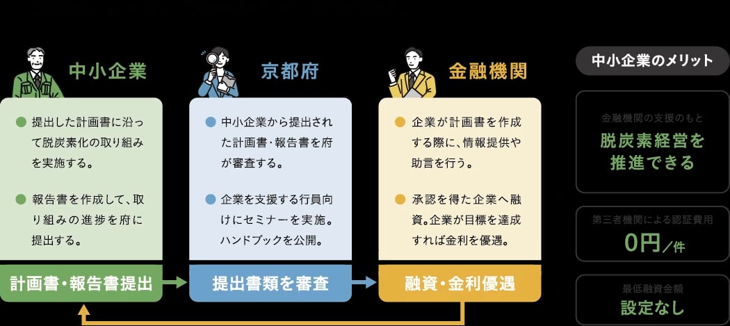 どのような支援が可能かを探るため、まずは府内に本店を置く4行に協働を呼びかけたという。加えて、多数の会員企業を抱える経済団体や行政など、様々な関係団体を交えて検討を開始。令和5年1月に構築したのが「京都ゼロカーボン・フレームワーク」だ。