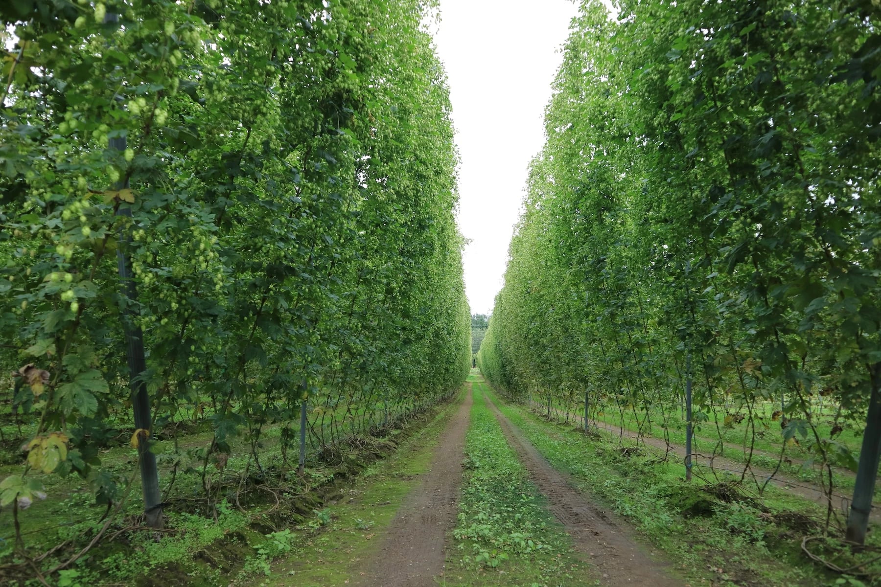 ホップはつる性の多年草植物で、何かに絡まっていないと上に伸びていけないのですが、ホップ栽培では上にロープを渡しそこにつるをひっかけて伸ばしていきます。夏が収穫時期で、その時期になると高さ8メートルほどにもなります。